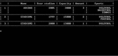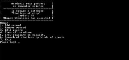 for (int i=0; i for (int j=i+1; j if ( (strcmp (strupr (s [j]. Name),strupr (s [i]. Name)) <0) || (strcmp (s [i]. Name,"") ==0)) { temp=s [j] ; s [j] =s [i] ; s [i] =temp; } return; } void prin_head () { printf ("-----------------------------------------------------------------------------\n"); printf ("| | Name | Year stadium | Capacity | Amount | Sports |\n"); printf ("-----------------------------------------------------------------------------\n"); return; } void prin (int i) { char pr=' '; printf ("|%2d |", i+1); strok++; printf ("%15s |",s [i]. Name); printf ("%12d |",s [i]. D_cr); printf ("%8d |",s [i]. Sapacity); printf ("%6d |",s [i]. C_pl); for (int j=0; j if (j==0) printf ("%15s |\n",s [i]. N_sp [j]); else if (strok! =44) { printf ("|%2c |%15c |%12c |%8c |%6c |%15s |\n",pr,pr,pr,pr,pr,s [i]. N_sp [j]); strok++; } else{printf ("Press any key for continue"); getch (); clrscr (); strok=0; } } printf ("-----------------------------------------------------------------------------\n"); strok++; return; } void prin_all () { clrscr (); prin_head (); strok=3; for (int i=0; i prin (i); } printf ("\n"); return; } void add () { tm *T; time_t tt; tt=time (NULL); T=localtime (&tt); Count++; clrscr (); printf ("\n\t\t\t\tADD RECORD\n"); printf ("Enter Name stadium (no more 15 symbols): "); scanf ("%s",s [Count-1]. Name); strupr (s [Count-1]. Name); do { printf ("Enter Date of construction: "); scanf ("%d",&s [Count-1]. D_cr); }while ( (s [Count-1]. D_cr (T->tm_year+1900))); do { printf ("Enter sapacity of stadium: "); scanf ("%d",&s [Count-1]. Sapacity); }while (s [Count-1]. Sapacity<1); do { printf ("Enter Amount platforms (no more 10): "); scanf ("%d",&s [Count-1]. C_pl); } while (s [Count-1]. C_pl10); for (int i=0; i printf ("Enter sport%d (no more 15 symbols): ", i+1); scanf ("%s",s [Count-1]. N_sp [i]); strupr (s [Count-1]. N_sp [i]); } alf (); printf ("New record is added\n"); getch (); return; } void remov () { int num=0; clrscr (); printf ("\n\t\t\t\tREMOVE RECORD\n"); prin_all (); while (numCount) { printf ("Enter number record for edit: "); scanf ("%d",&num); } printf ("You have chosen record: \n"); prin_head (); prin (num-1); printf ("Do you want remove record? (Y\\N) \n"); if ( (getch () =='y') || (getch () =='Y')) { strcpy (s [num-1]. Name,'\0'); s [num-1]. D_cr=0; s [num-1]. Sapacity=0; for (int i=0; i strcpy (s [num-1]. N_sp [i],'\0'); s [num-1]. C_pl=0; alf (); Count--; printf ("Record is removed\n"); getch (); } return; } void edit () { tm *T; time_t tt; tt=time (NULL); T=localtime (&tt); stadiums temp; int num=0, i; clrscr (); printf ("\t\t\tEDIT RECORD\n"); prin_all (); while (numCount) { printf ("Enter number record for edit: "); scanf ("%d",&num); } clrscr (); printf ("You have chosen record: \n"); prin_head (); prin (num-1); printf ("Enter new Name stadium (no more 15 symbols): "); scanf ("%s",temp. Name); strupr (temp. Name); do { printf ("Enter new Date of construction: "); scanf ("%d",&temp. D_cr); } while ( (temp. D_cr (T->tm_year+1900))); do { printf ("Enter new Sapacity of stadium: "); scanf ("%d",&temp. Sapacity); } while (temp. Sapacity<1); do { printf ("Enter new Amount platforms (no more 10): "); scanf ("%d",&temp. C_pl); } while (temp. C_pl10); for (i=0; i printf ("Enter new sport%d (no more 15 symbols): ", i+1); scanf ("%s",temp. N_sp [i]); strupr (temp. N_sp [i]); } printf ("Do you want change record? (Y\\N) \n"); if ( (getch () =='y') || (getch () =='Y')) { strcpy (s [num-1]. Name,temp. Name); s [num-1]. D_cr=temp. D_cr; s [num-1]. Sapacity=temp. Sapacity; s [num-1]. C_pl=temp. C_pl; for (i=0; i strcpy (s [num-1]. N_sp [i],temp. N_sp [i]); alf (); printf ("Record is changed\n"); getch (); } return; } void prin_vmes () {int i, cap; clrscr (); printf ("\t\t\tSEAL ON CAPACITY\n"); printf ("Choose a kind: \n"); printf ("1. =\n"); printf ("2. >\n"); printf ("3. <\n"); printf ("4. >=\n"); printf ("5. <=\n"); switch (getch ()) { case '1': printf ("Enter capacity (=): "); scanf ("%d",&cap); prin_head (); for (i=0; i if (s [i]. Sapacity==cap) prin (i); break; case '2': printf ("Enter capacity (>): "); scanf ("%d",&cap); prin_head (); for (i=0; i if (s [i]. Sapacity>cap) prin (i); break; case '3': printf ("Enter capacity (<): "); scanf ("%d",&cap); prin_head (); for (i=0; i if (s [i]. Sapacity break; case '4': printf ("Enter capacity (>=): "); scanf ("%d",&cap); prin_head (); for (i=0; i if (s [i]. Sapacity>=cap) prin (i); break; case '5': printf ("Enter capacity (<=): "); scanf ("%d",&cap); prin_head (); for (i=0; i if (s [i]. Sapacity<=cap) prin (i); break; } getch (); return; } void find () { char sport [15] ; int i,j; clrscr (); printf ("\t\t\tSEAL KIND OF SPORT\n"); printf ("Enter sport (no more 15 symbols): "); scanf ("%s",sport); prin_head (); for (i=0; i for (j=0; j if (strcmp (strupr (s [i]. N_sp [j]),strupr (sport)) ==0) prin (i); getch (); return; } int main () { clrscr (); FILE* f; char c; Count=0; if ( (f=fopen ("C: \\Student\\05IS\\db. kp","rb")) ==NULL) { printf ("The file does not exist\n"); fclose (f); printf ("You want continue? (Y\\N) \n"); c=getch (); if ( (c=='n') || (c=='N')) return 1; } else { fread (&s,sizeof (s),1,f); for (int i=0; s [i]. D_cr! =0; i++) Count=i+1; alf (); } fclose (f); while (1) { clrscr (); printf ("---------------------------------\n"); printf ("| Academic year project |\n"); printf ("| on Computer science |\n"); printf ("| - -----------------------------|\n"); printf ("| To create a database |\n"); printf ("| \"Stadiums of city\" |\n"); printf ("| Variant #8 |\n"); printf ("| Okunev Stanislav has executed |\n"); printf ("---------------------------------\n"); printf ("Menu: \n"); printf ("1. Add record\n"); printf ("2. Remove record\n"); printf ("3. Edit record\n"); printf ("4. Show all stadiums\n"); printf ("5. Show stadiums on capacity\n"); printf ("6. Search of stadiums by kinds of sports\n"); printf ("7. Exit\n"); printf ("Press key: "); c=getch (); switch (c) { case '1': add (); break; case '2': remov (); break; case