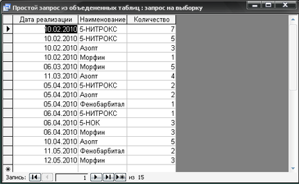 Для работы с БД был создан запрос из объединенных таблиц («Лекарства» и «Реализация») – рис. 1.9-1.10.