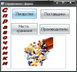По нажатию кнопки справочники появляется форма «Справочники» (рис.1.14). Для оформления данной формы также были использованы графические возможности Microsoft Access: добавлен рисунок и надпись в стиле «WordArt». Форма справочники обеспечивает навигацию с таблицами «Лекарства», «Поставщики», «Места хранения», «Производители». По нажатию на одноименные кнопки появятся формы к указанным таблицам, позволяющие осуществлять ввод данных.