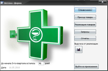 С помощью графических инструментов Microsoft Access на форму добавлен логотип аптеки. На форме «Аптека» также отражается информация о текущей дате и остатке дней до начала третьего квартала 2010 года. Данная динамическая информация реализована при помощи встроенных функций СУБД Microsoft Access – Date() и DateDiff(). Функция Date() возвращает полю значение текущей даты, а встроенная функция DateDiff() временной интервал между заданными промежутками времени.