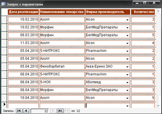 Ленточные автоформы также были созданы для запросов, организованных к БД «Аптека», например для запроса с параметром (рис. 1.12).