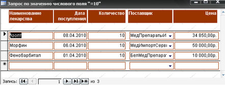 В курсовой работе также был организован запрос к БД «Аптека» по значению численного поля. Данный запрос позволяет получить информацию о ле5карственных препаратах, поступивших в аптеку в количестве «10» размерных единиц. Результат работы данного запроса демонстрирует рис. 1.4.