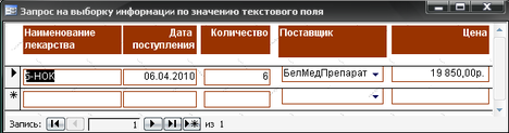 Был организован запрос на выборку по значению текстового поля, который отображает информацию по приходу лекарственного средства «5-НОК». Результат запроса представлен на рис. 1.2.