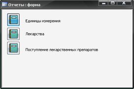 В рамках данной курсовой работы были созданы три отчета: «Лекарства», «Поступления лекарственных средств», «Единицы измерения» (рис. 1.18-1.19). Отчеты доступны с формы «Отчеты», вызываемой по нажатию кнопки «Отчеты» с главной формы «Аптека». Отчеты «Лекарства» и «Единицы измерения» созданы по соответствующим таблицам и без дополнительных изменений и выводят данные, содержащиеся в них. В отчете «Поступление лекарственных средств» создано дополнительное вычисляемое поле «Стоимость партии», рассчитываемое как [Цена закупки]*[Количество]. При создании отчетов изменены размер шрифта, цвет полей и границ, добавлен логотип аптеки. Фрагмент отчета «Поступление лекарственных средств» представлен на рис. 1.20.