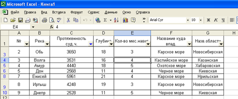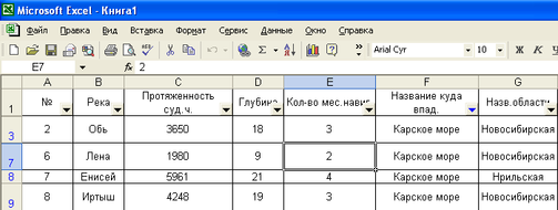 2.Далее необходимо сформировать список рек, впадающих в выбранный пользователем водоем. Вводим курсор в пределы таблицы и выполняем команду «Данные – Фильтр – Автофильтр». После этого в каждой ячейке заголовка столбцов появится кнопка раскрывающегося списка. Щелкаем на кнопке поля и из появившегося списка выбираем интересующий нас водоем. Например, Карское море.