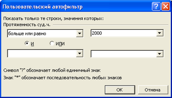 1.Необходимо сформировать список рек, протяженность которых не ниже запрашиваемой величины. Вводим курсор в пределы таблицы и выполняем команду «Данные – Фильтр – Автофильтр». После этого в каждой ячейке заголовка столбцов появится кнопка раскрывающегося списка. Щелкаем на кнопке поля «Протяженность» и из появившегося списка выбираем команду «Условие», после чего на экран выводится пользовательский автофильтр.