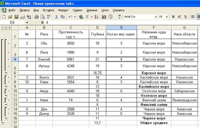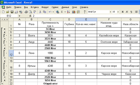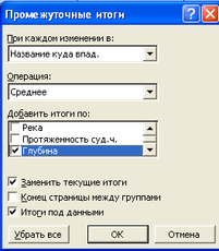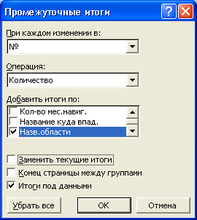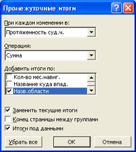 Чтобы вычислить суммарную протяженность рек по областям, необходимо ввести курсор в пределы таблицы, затем выполнить команду «Данные-итоги», появляется окно: