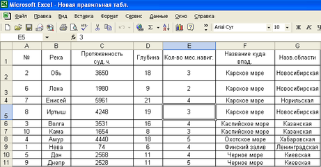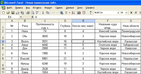 В ячейки А1 – G1 вводим соответственно: порядковый номер, название реки; протяженность судоходной части; глубина фарватера; количество месяцев навигации в году; название водоема, куда река впадает; название области, где река располагается. Выделяем эти ячейки и выполняем команду «Формат – Ячейки – Выравнивание». В окне «Выравнивание» устанавливаем тип: по горизонтали – по центру; по вертикали – по центру; и устанавливаем флажок параметру «Перенос по словам». Затем изменяем ширину столбцов.