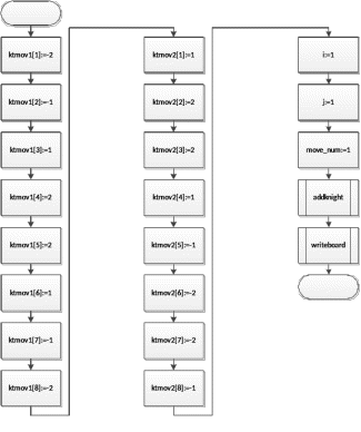 Кінь, що знаходиться в позиції (i,j), може наступним ходом опинитися в клітинках з кординатами (i-2, j+1), (i-1, j+2), (i+1, j+2), (i+2,,j+1), (i+2,,j-1), (i+1, j-2), (i-1, j-2), (i-2, j-1). Якщо кінь стоїть з краю дошки, то деякі його ходи можуть викликати переміщення за межі дошки, а це недопустимо. Вісім можливих переміщень даної фігури задані в вигляді двох масивів ktmov1 [8] та ktmov2 [8].