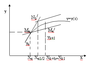 Сначала вычисляют вспомогательные значения искомой функции ук+1/2 в точках хк+1/2, затем находят значение правой части уравнения (11) в средней точке y/k+1/2=f(xk+1/2, yk+1/2) и определяют ук+1.