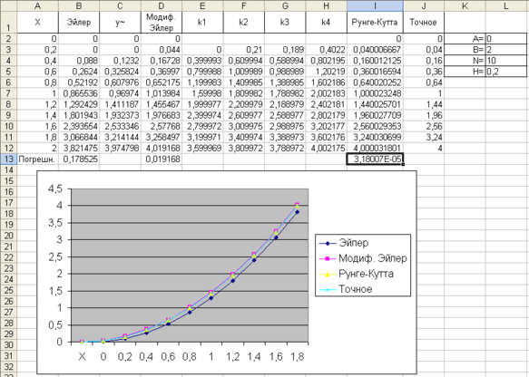 Здесь решается уравнение dy/dx = 2x-y+x2 на интервале [0,2], начальное значение y(0)=0, для оценки точности задано также точное решение в виде функции u(x)=x2. Оценка погрешности делается в нормеL1, как и принято в данном случае