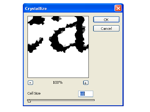 3. Кристаллизуйте полученный текст – фильтр кристаллизации доступен через меню Filter – Pixelate – Crystallize. В диалоговом окне Crystallize установите размер ячейки кристаллизации порядка 3-5 пикселов.