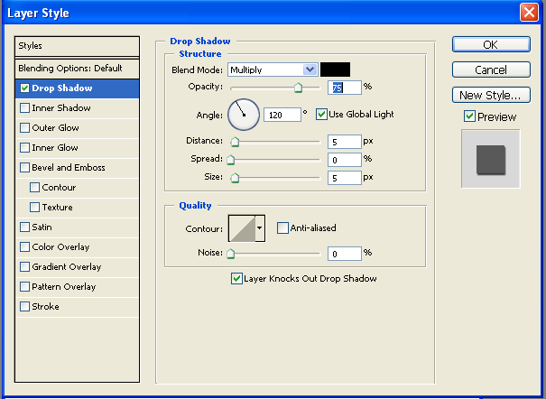 Создать эффект нависающего текста. Для этого сделать активным слой с текстом и вызвать команду Layer – Layer Style – Drop Shadow (Слой – Стили слоя – Внешняя тень).