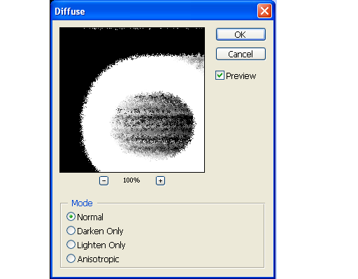 7. Нажать Filter – Stylize – Diffuse – он создает эффект диффундирующих цветов: цвета от язычков пламени проникают в цвет фона и наоборот. Установите в разделе Mode переключатель Normal.