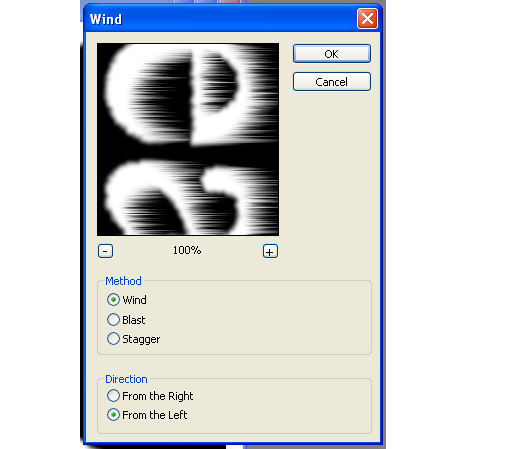 7. Создать язычки пламени Filter – Stylize – Wind. Используйте переключатель From the left (Ветер слева). После неоднократного применения фильтра Wind у вас должны появиться довольно длинные язычки пламени.