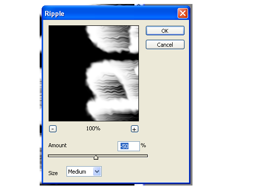 10. Нажмите Filter – Distort – Ripple для придания пламени движения. Необходимо взять средний (Medium) размер ряби (Size) и сделать параметр Amount равным 100%