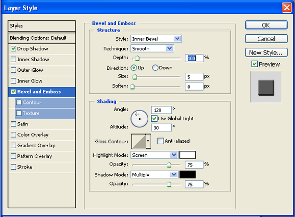 Придать объём буквам. Для этого необходимо сделать слой с текстом активным и воспользоваться Layer – Layer Style – Bevel and Emboss (Слой – Стили слоя – Скос и рельеф).