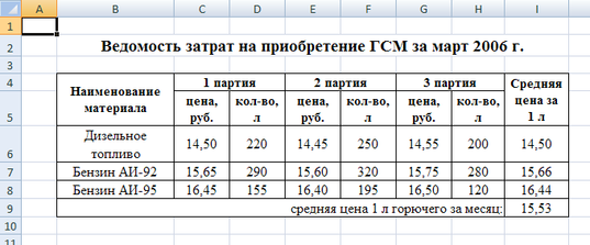 Выполнить расчет средней цены 1 л. топлива по каждому виду, данные расчета занести в таблицы (рис. 1). Средняя цена определяется как отношение общей суммы затрат на приобретение данного вида топлива в течение месяца к общему количеству приобретенного топлива за месяц.