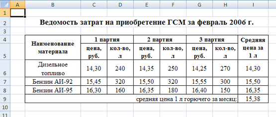 Выполняем расчет средней цены 1 л горючего за месяц: в ячейку I9 вводим формулу =СУММ(I6:I8)/3.