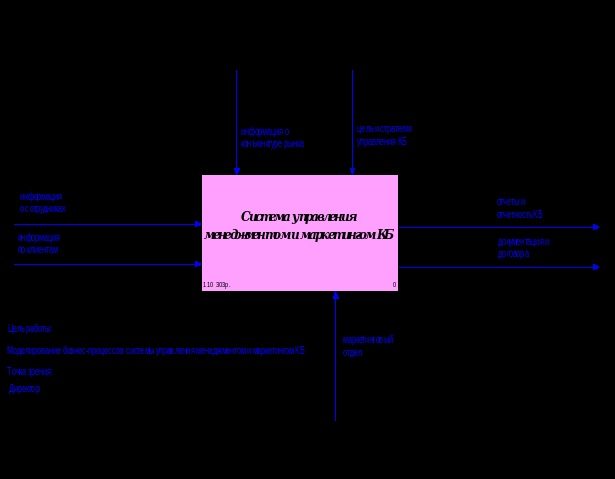 Контекстная диаграмма является вершиной древовидной структуры диаграмм и представляет собой самое общее описание системы и ее взаимодействия с внешней средой. Контекстная диаграмма состоит из одной работы, которая называется «Система управления менеджментом и маркетингом КБ». Взаимодействие работы с внешним миром описывается в виде стрелок, которые представляют собой некую информацию и именуются существительными. В данной работе описаны стрелки типа вход (Input), «информация о сотрудниках» и «информация по клиентам», они представляют собой входную информацию. Стрелка типа выход (Output), «документация и договора» содержит в себе выходную информацию. Стрелка «маркетинговый отдел» является стрелкой типа механизм (Mechanizm) и входит в нижнюю грань работы. Стрелки «информация о конъюнктуре рынка», «цель и стратегия управления» являются стрелками типа управление (Control), входят в верхнюю грань работы и показывает правила, процедуры, которыми руководствуется работа «Система управления менеджментом и маркетингом КБ».