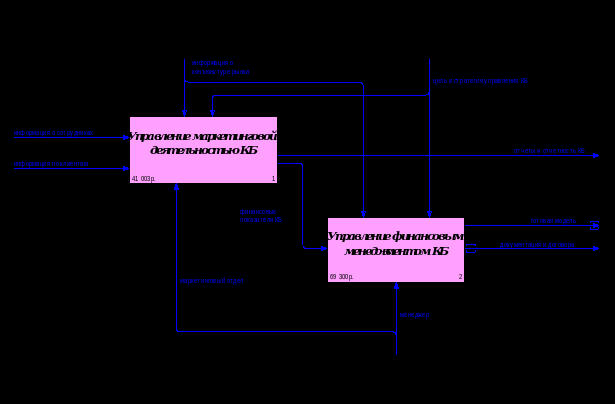 Декомпозиция контекстной диаграммы имеет номер А0 (рис.2). Эта декомпозиция состоит из следующих основных работ «Управление маркетинговой деятельностью КБ», «Управление финансовым менеджментом КБ».