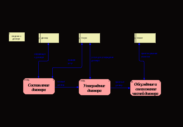 В диаграмме потоков данных (рис.7) под названием «Оформление документации и договоров» показаны хранилища данных под названиями «Услуги», «Договор», «Клиент», показана внешняя ссылка «Сведения о договоре». Данная диаграмма состоит из следующих работ:
