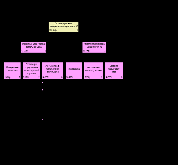 Диаграмма дерева узлов показывает иерархию работ в модели и позволяет рассмотреть всю модель целиком, но не показывает взаимосвязи между работами. Процесс создания модели работ является итерационным, следовательно, работы могут менять свое расположение в дереве узлов многократно. Чтобы не запутаться и проверить способ декомпозиции, следует после каждого изменения создавать диаграмму дерева узлов. Диаграмма дерева узлов работы «Система управления менеджментом и маркетингом КБ» состоит из четырех уровней и будет иметь следующий вид: