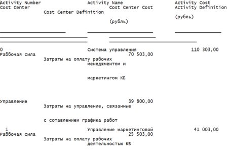| Имя работы (Activity name) | Цент затрат (Cost Center) | Сумма центра затрат (Cost Center Cost)t,руб. | Продолжи тельность Duration день) | Частота (Frequency) |