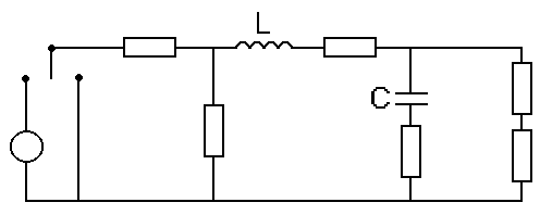 Дана схема электрической цепи, содержащая источник переменного тока, катушку индуктивности, конденсатор, набор резисторов и ключ.