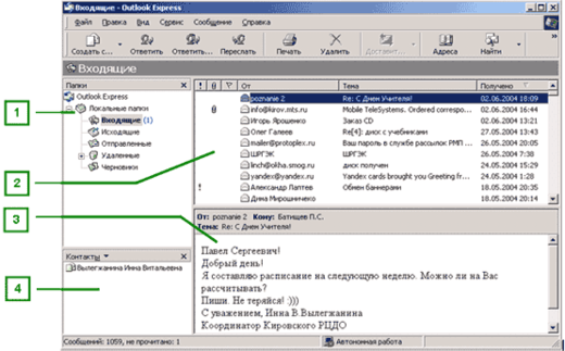 Панель папок – здесь отображаются все имеющиеся папки сообщений в виде древовидной структуры. Чтобы выбрать папку, нужно щелкнуть по ее названию. Если имя папки выведено жирным шрифтом, значит, в папке имеются непрочитанные сообщения, их количество указано в скобочках. Общее количество сообщений в папке отображается в строке состояния.