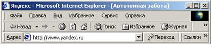Для загрузки и просмотра нужной страницы необходимо указать ее адрес в адресной строке (Рис. 2.1.3.). Щелкните мышью адресную строку и введите доменное имя сервера, например, http://www.yandex.ru (можно просто yandex.ru). Если страница просматривалась ранее, то при вводе адреса откроется меню, из которого можно выбрать строку с нужным адресом. После ввода адреса нажмите клавишу Enter или щелкните мышью по кнопке Переход.