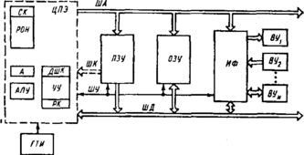МПВУ минимальной конфигурации содержит ЦПЭ, блоки ПЗУ и ОЗУ, генератор тактовых импульсов ГТИ и блок интерфейса (ИФ), через который осуществляется связь с внешними устройствами (ВУ). Будем считать, что МПВУ, представляющее собой специализированное вычислительное устройство, используется в аппаратуре для выполнения некоторого заданного алгоритма обработки информации (или совокупности алгоритмов).