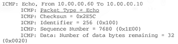 Якщо дві команди повертаються з повідомленням про помилку, то має місце проблема. Необхідно скористатись Netmon і перевірити чи можливо знайти джерело проблеми. Із отриманих даних видно, що команда ping працює фактично без будь-яких проблем. Це показано на роздруківці нижче. Пакет ICMP є ехо-пакетом і його розмір 32 байти. Цей розмір використовується за замовчуванням в команді ping.