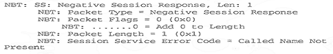 Отримана відповідь з відмовою сеансу (Negative Session Response), і код помилки служби сеансу говорить про те, що ім’я, яке викликається, відсутнє. Завдяки цьому стає зрозуміло, що проблема не в робочій станції, а в сервері. Інші робочі станції будуть стикатися з такою ж проблемою. Тепер необхідно перевірити, що відбувається на сервері. Але спочатку необхідно глянути, чи можна отримати яку-небудь додаткову інформацію із щойно зробленого трасування Netmon.