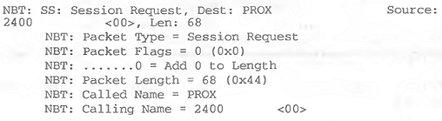 Після цього командою net view\\ ім’я_сервера перевіряється мережу, що приводить до трьохходового підтвердження прийому даних (квитування) між робочою станцією і сервером. Трьохходове квитування відбувається між робочою станцією і портом 139, службою сеансу NetBIOS на сервері. В даному випадку все працює нормально, тому необхідно подивитися розділ NBT наступного кадру, що показаний на роздруківці нижче. Кадр із робочої станції на сервер виглядає правильним. Видно, що тип пакету вказується як запит сеансу (session request). Він вміщує ім’я викликаного сервера і ім’я робочої станції яка викликає. є унікальним суфіксом NetBIOS, який вказує службу робочої станції. Можна знайти реєстрацію для цієї машини в базі даних WINS. Реєстрація в базі даних WINS полегшує NetBIOS комунікацію між машинами.