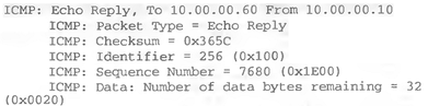 За ехо-пакетом ІСМР слідує пакет відповіді ІСМР, який пердставлений на роздруківці нижче. Цей пакет повертається із місця призначення як пакет ехо-відповідь. Він також має 32 байти. Це говорить про те, що існує елементарна комунікація між робочою станцією і сервером.