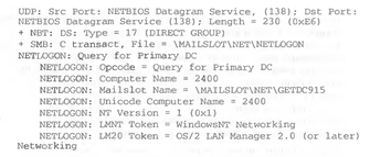 На роздруківці нижче наведено декілька запитів контролера первинного домену, але немає відповіді. Це відбувається як SMB C transact в \mailslot\net\netlogon. Можливо існує також проблема із службою netlogon.