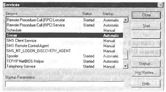 Чи служба сервера виконується на комп'ютері місця призначення. Перевірити аплет служб в панелі керування (рис.2.1). Якщо служба сервера не виконується, машина все одно відповідатиме на ping, але сеанс створити неможливо. Якщо служба сервера зупинена, то необхідно запустити її. Це пояснить повідомлення помилок броузера в журналі подій, оскільки служба броузера комп'ютера залежить від служби сервера. Крім того, служба netlogon також залежить від служби сервера. Питання, звичайно, в тому, чому служба сервера зупинена? Деяку інформацію Netmon просто не може повідомити. Можливо, настав час змінити пароль адміністратора.