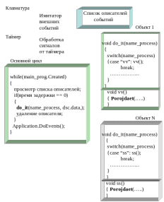 Таким образом, при возникновении события будет формироваться его описатель и помещаться в список событий, ожидающих завершения времени задержки. Ведение этого списка возлагается на главную программу. В состав главной программы должны быть введены процедура занесения описателя события в список (Porojdaet) и процедура реагирования на сигналы таймера. Последняя должна выполнять вычитание прошедшего времени из значения времени задержки каждого описателя события в списке.