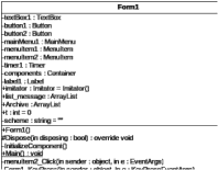 - Form1 - класс, задающий главную программу приложения и необходимые компоненты пользовательского интерфейса. Имя класса определяется тем, что оно зафиксировано в компиляторе UML проектов в MS Visio;
