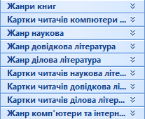 | Жанри літератури | Картки читачів | 1:1 | Має | не обов.; обов. |