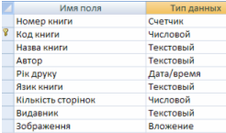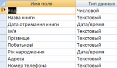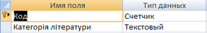 На рисунках 1.2, …, 1.4 зображено конструктори таблиці, в яких описано поля та їх типи,а також ключове поле, по якому будуть з’єднані наші таблиці.