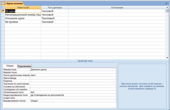 CREATE TABLE Курсы лечения (Регистрационный номер integer NOT NULL, № курса integer NOT NULL primary key, № приёма integer NOT NULL Foreign key, Описание курса char (50) NOT NULL);