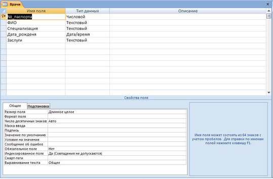 CREATE TABLE Врачи (ФИО char (50) NOT NULL, № паспорта integer NOT NULL primary key, Специализация char (50) NOT NULL , Дата рождения Data/time, Заслуги char (50) NOT NULL);