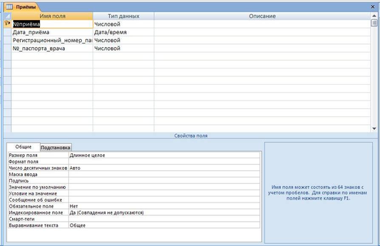 CREATE TABLE Приёмы (Регистрационный номер integer NOT NULL, Дата приёма Date/time NOT NULL, № приёма integer NOT NULL primary key , № паспорта врача integer NOT NULL);