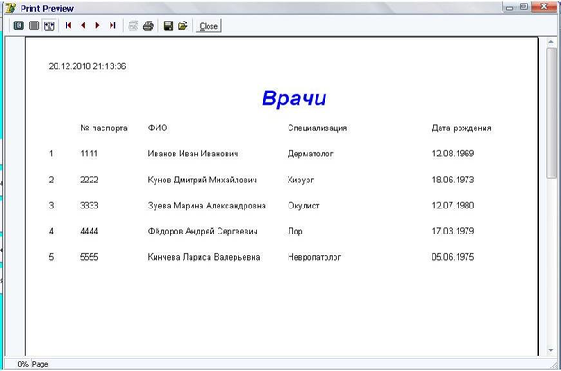 Рисунок 12 - Отчёт: Отчёт о текущих врачах