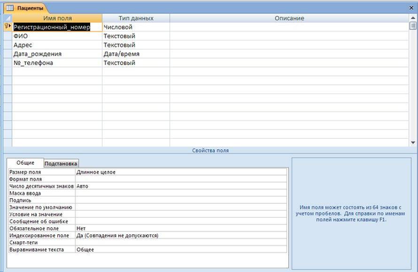 CREATE TABLE Пациенты (ФИО char (50) NOT NULL, Регистрационный номер integer NOT NULL primary key, Адрес char (50) NOT NULL , Дата рождения Data/time, № телефона integer NOT NULL);