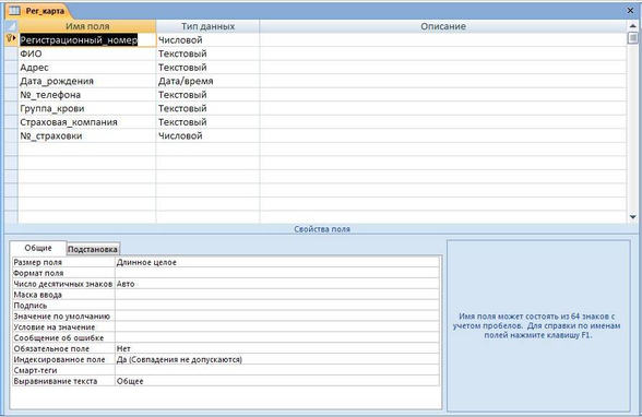 CREATE TABLE Рег. карта (ФИО char (50) NOT NULL, Регистрационный номер integer NOT NULL primary key , Адрес char (50) NOT NULL, Дата рождения Date/time NOT NULL, № телефона integer NOT NULL, Группа крови char (50) NOT NULL, Страховая компания char (50) NOT NULL, № страховки integer NOT NULL);