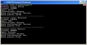 После выбора необходимого поиска появится окно для ввода указанных параметров. После того, как пользователь введёт параметры поиска, появится окно, содержащее непосредственно заданные параметры поиска и таблицу, в которой представлены торговые точки, удовлетворяющие этим параметрам. Для выхода в меню поиска требуется нажать любую клавишу.