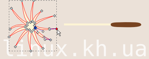 Инструментом "Рисовать круги, эллипсы и дуги" (F5) рисуем серединку одуванчика, красим её в серый цвет. С помощью Ctrl+C (копировать) и Ctrl+V (вставить) много раз копируем хохолок и располагаем по кругу вокруг серединки, поворачивая хохолки вокруг оси.